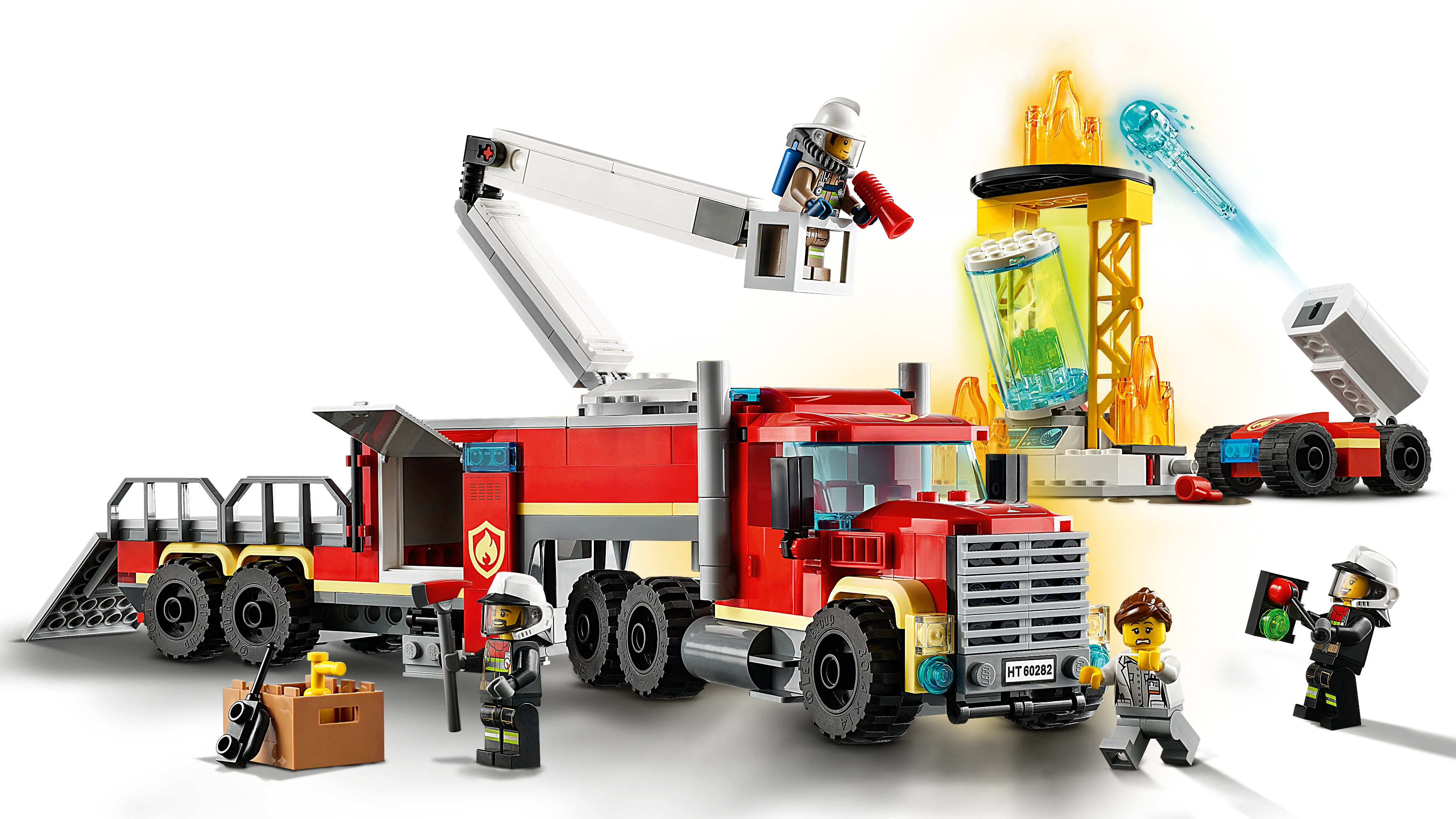 - The fire truck has a compartment for storing the firefighting accessories, plusa trailer with a ramp for transporting Toastie the firefighter robot. Includes 3 firefighter minifigures with helmets.